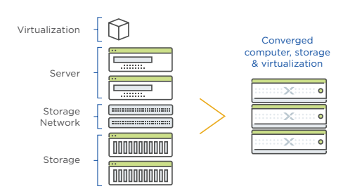 Geleneksel bir mimari üzerinde bulunan Datacenter donanımlarının bir cihaz üzerinde fiziksel olarak kombine edilmiş haline Converged mimari denir. Bu sayede geleneksel Datacenter mimarisinin yerine yönetimi daha kolay, daha esnek bir yapı geçer; Datacenter ortamında daha az yer kaplar, çünkü 2U’luk bir Appliance üzerinde Server, Storage vd. birçok cihazı barındırır. Daha da önemlisi, geleneksel bir mimari oluştururken bütün donanımların birbiriyle uyumlu olması gerekir ve bu o kadar ciddi bi’ konudur ki, firmalar bu iş için ayrıca danışmanlık alırlar. HCI tarafında ise, firmalar direkt olarak donanım üreticileri ile çalıştıkları için en uyumlu kombinasyonu sağlayıp bir bütün halinde teslim ederler. Fabrikadan teslim ürün gibi düşünülebilir.